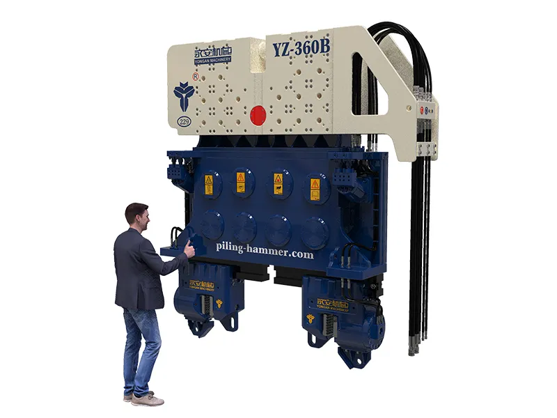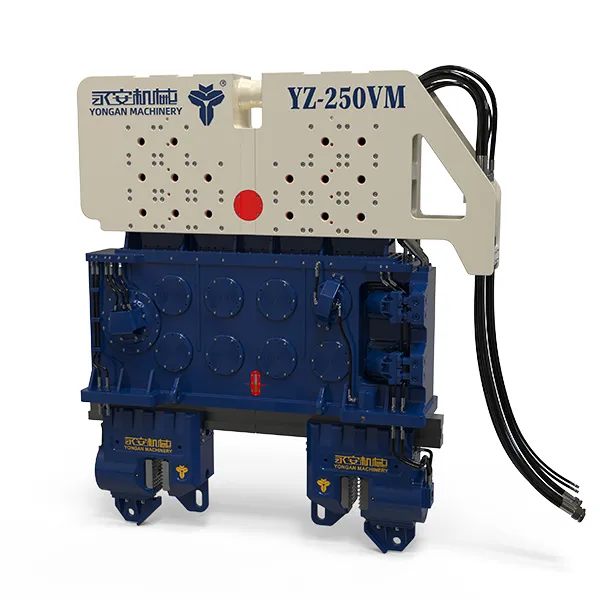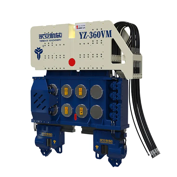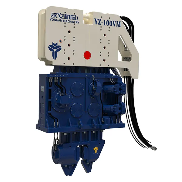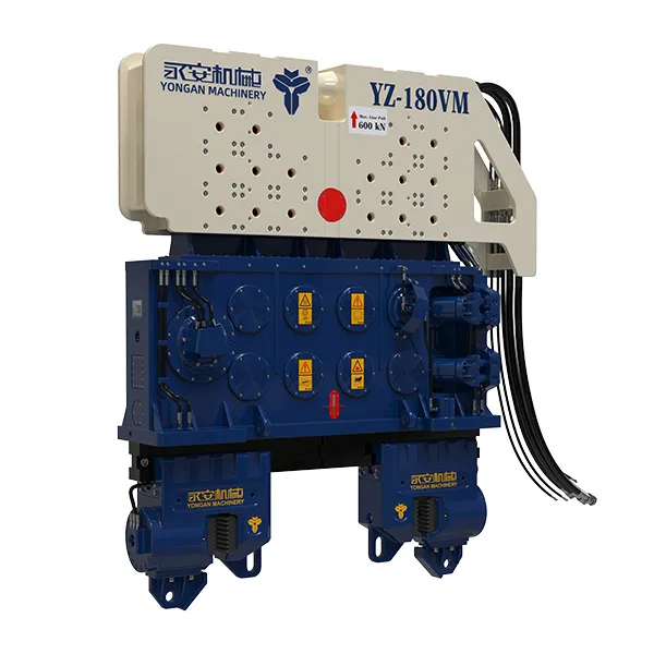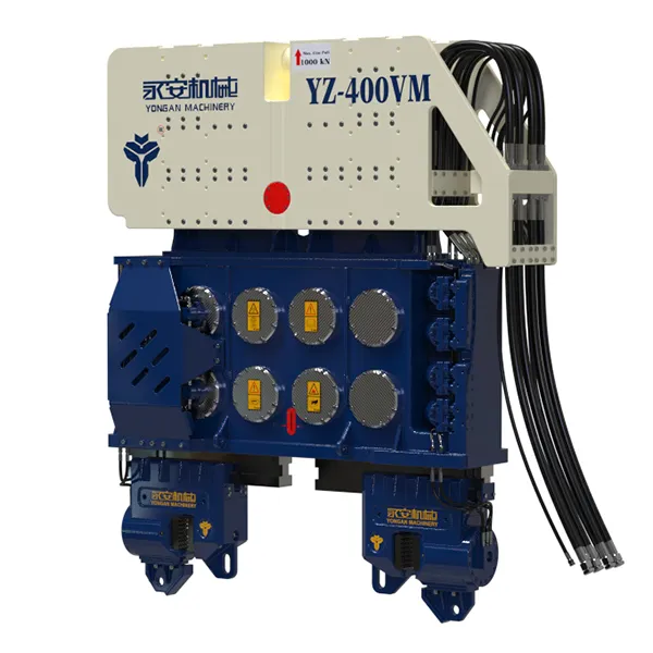 Vibrofonceur suspendu par grue pour battage ou extraction de pieux Nos vibrofonceurs à moment variable sans résonance (série VM) se distinguent par leurs caractéristiques de haute fréquence et de résistance à la résonance, offrant une plage de force centrifuge maximale allant de 1030kN à 4350kN. La personnalisation est disponible pour répondre à vos exigences spécifiques. La haute fréquence permet à nos marteaux de pénétrer efficacement le sol. La résistance à la résonance garantit un battage de pieux plus sûr. Les marteaux de la série VM peuvent être installés facilement et sont équipés de pinces et de poutres, offrant des solutions de battage de pieux stables et efficaces.